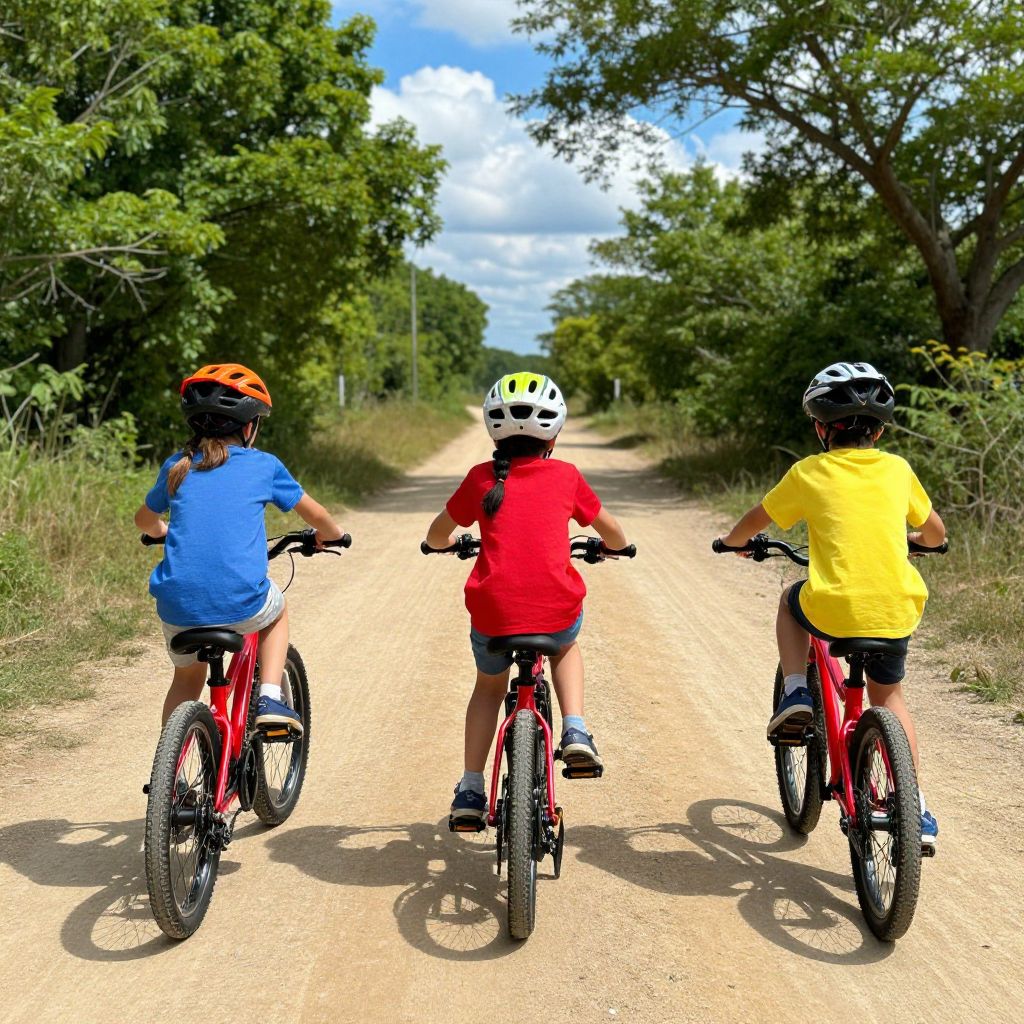 Photograph of three children riding red bicycles on a dirt path, wearing helmets and colorful shirts, surrounded by lush green trees under a bright blue sky.