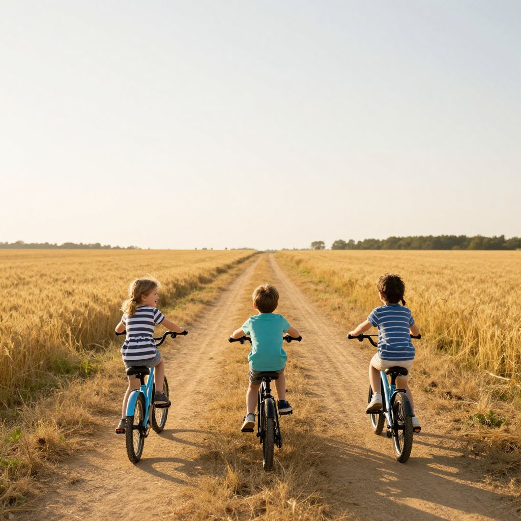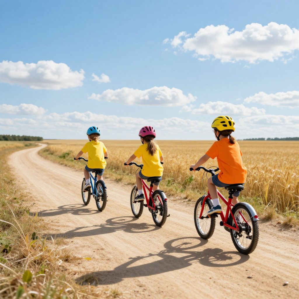 Three children wearing colorful helmets and vibrant shirts ride identical red bicycles along a sunlit dirt path, casting distinct shadows beneath them as they journey toward a horizon framed by lush green trees and fluffy white clouds.