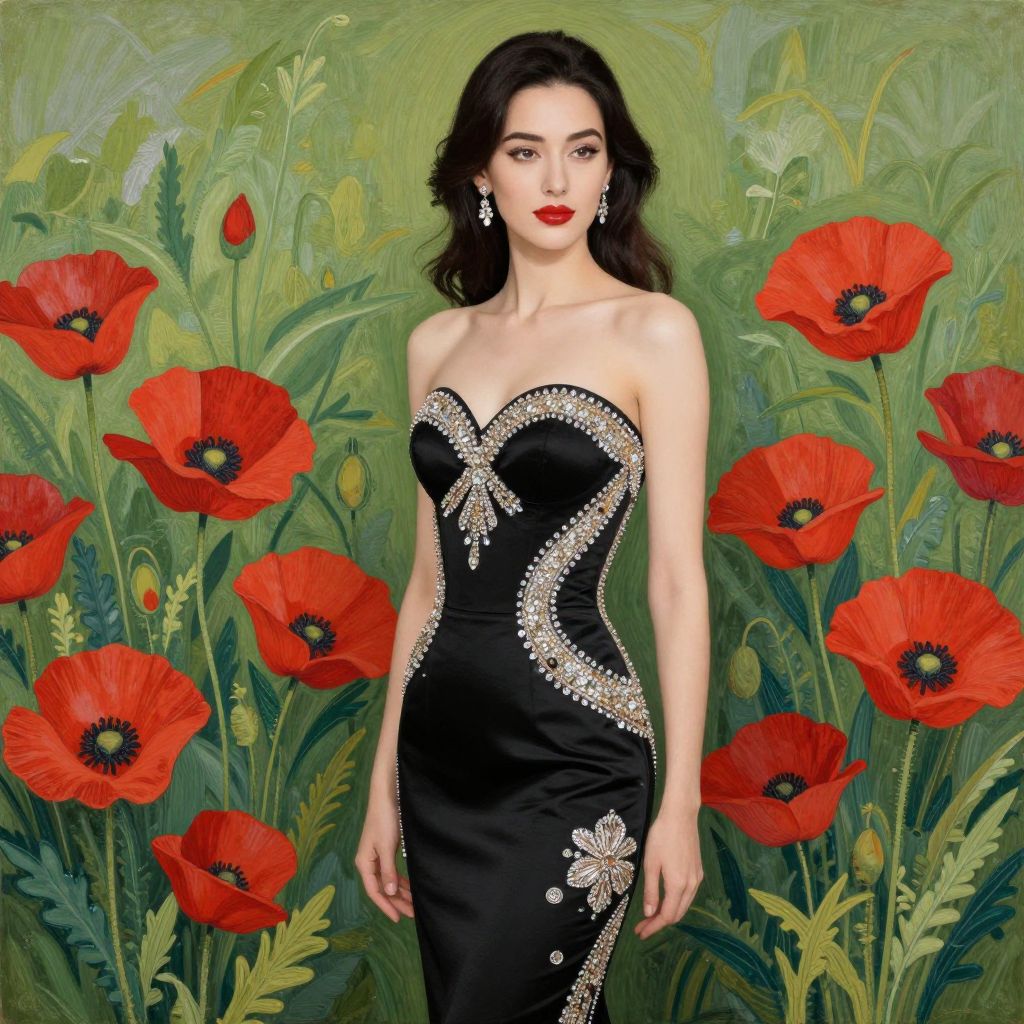 A digital painting depicts a fair-skinned woman with dark, wavy hair, red lipstick, and black strapless gown adorned with sparkling silver embroidery. She stands confidently against a lush, green background of tall poppy plants with bright red petals and green leaves. Her earrings match the gown's silver details. The woman's gaze is direct, and her posture is upright. The style is realistic with a slight impressionistic touch in the floral background. The poppies are vividly detailed, contrasting with the smooth texture of her elegant dress.