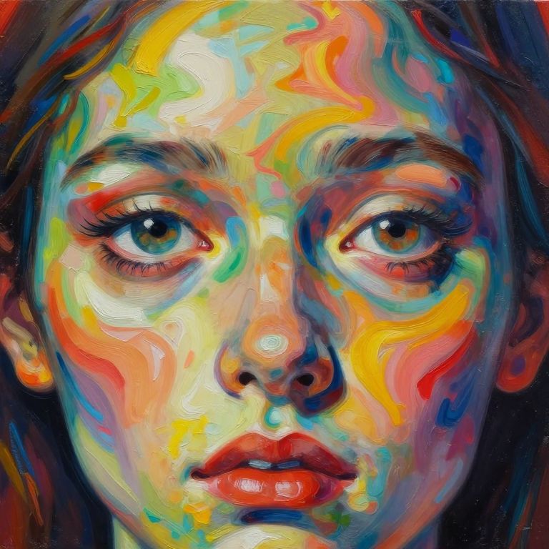 Surreal artwork depicting strabism as a visual metaphor, eyes pointing in different directions with vibrant swirling colors, abstract patterns blending into facial features, expressive brush strokes, emotional and thought-provoking mood.