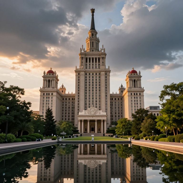 Photograph of the Palace of Culture and Science in Warsaw, Poland, reflecting in a symmetrical pool, with dramatic clouds and sunset lighting.