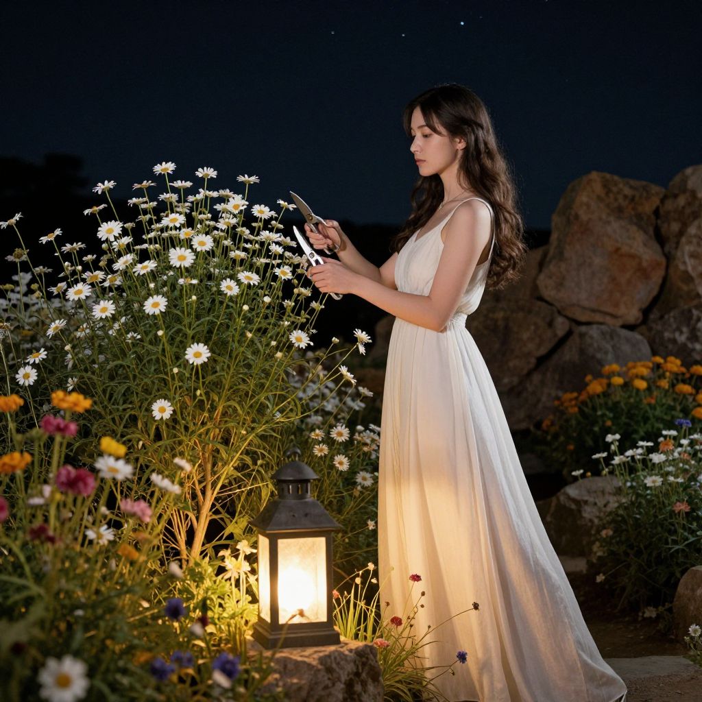 A young woman in a flowing gown stands by a lantern-lit garden under a starry night sky, gently pruning delicate white daisies with silver shears while surrounded by vibrant wildflowers and rocky terrain.