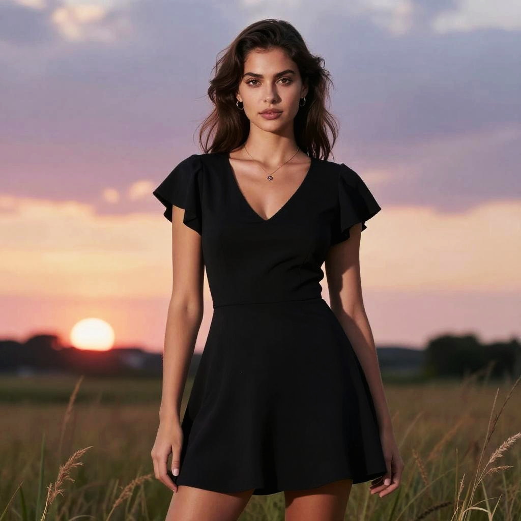 A willowy woman in a black mini skater dress with white polka dots and a wide-brimmed felt hat, captured in a Yen Press style, enjoying a sunset stroll on the shore. Sexy. Pretty face and beutiful eyes