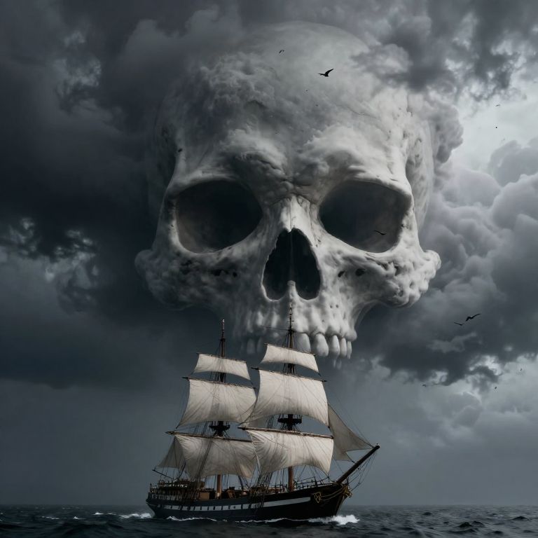 The image depicts a dramatic scene where a ship, likely an old sailing vessel, is surrounded by a thick, dark cloud formation, The cloud is shaped in a way that strikingly resembles a skull face, giving the scene an ominous, almost supernatural feel, Birds are seen flying near the ship, adding to the eerie atmosphere, The overall mood of the image suggests themes of adventure, mystery, or even horror