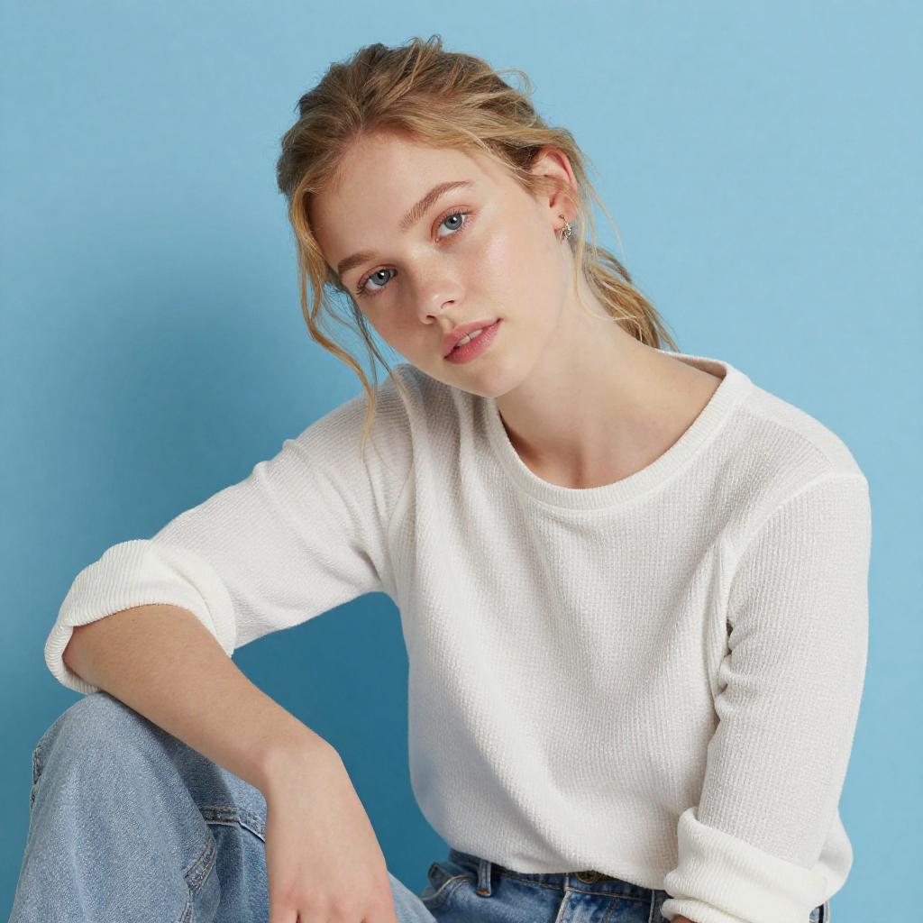 Photograph of a young woman with long, wavy blonde hair and fair skin, wearing a peach short-sleeve top and white high-waisted pants. She sits with one knee raised, holding a white, ured blanket. She has light makeup, blue eyes, and a subtle smile. The background is a gradient of light blue.