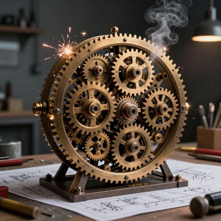 Diffi visualized as a highly detailed mechanical device with countless gears and cogs, intricately meshed together, surrounded by sparks of light and steam, set in a dimly lit workshop environment filled with tools and blueprints.