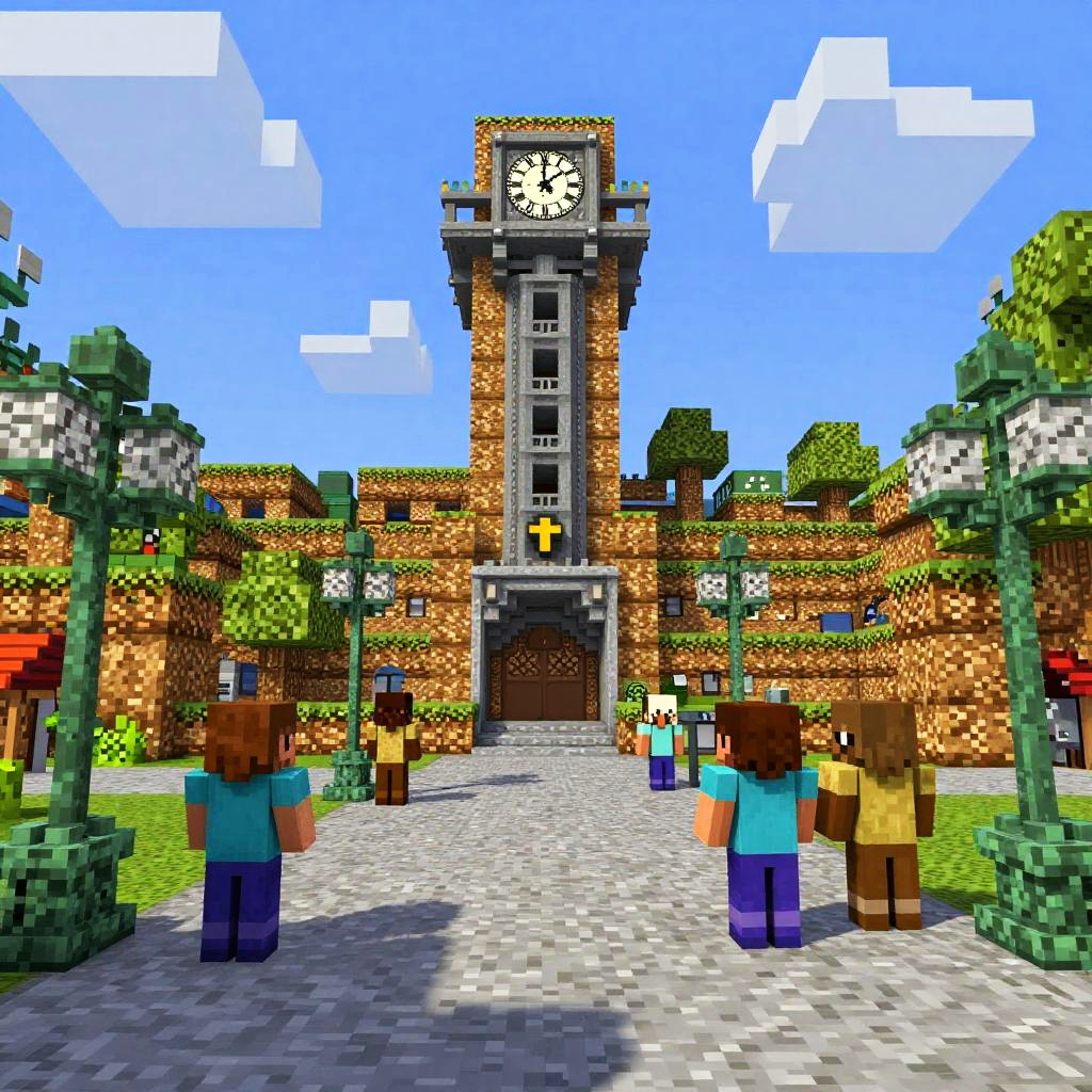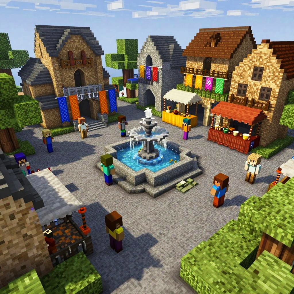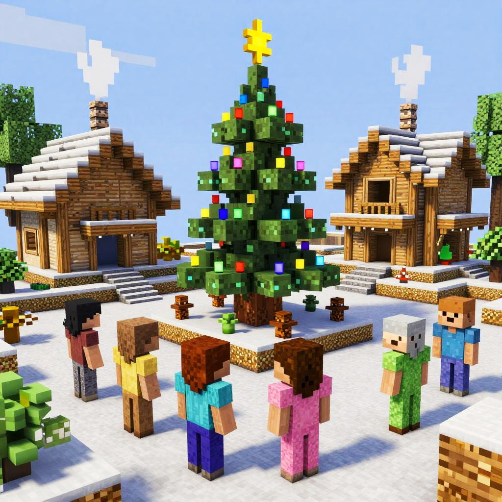 Nighttime Minecraft town square glowing under fairy lights strung between timber-framed shops, villagers gathered around a bonfire, pixelated starry sky above, festive decorations, detailed cobblestone ground and wooden market stalls, warm orange hues contrasting with cool night tones.