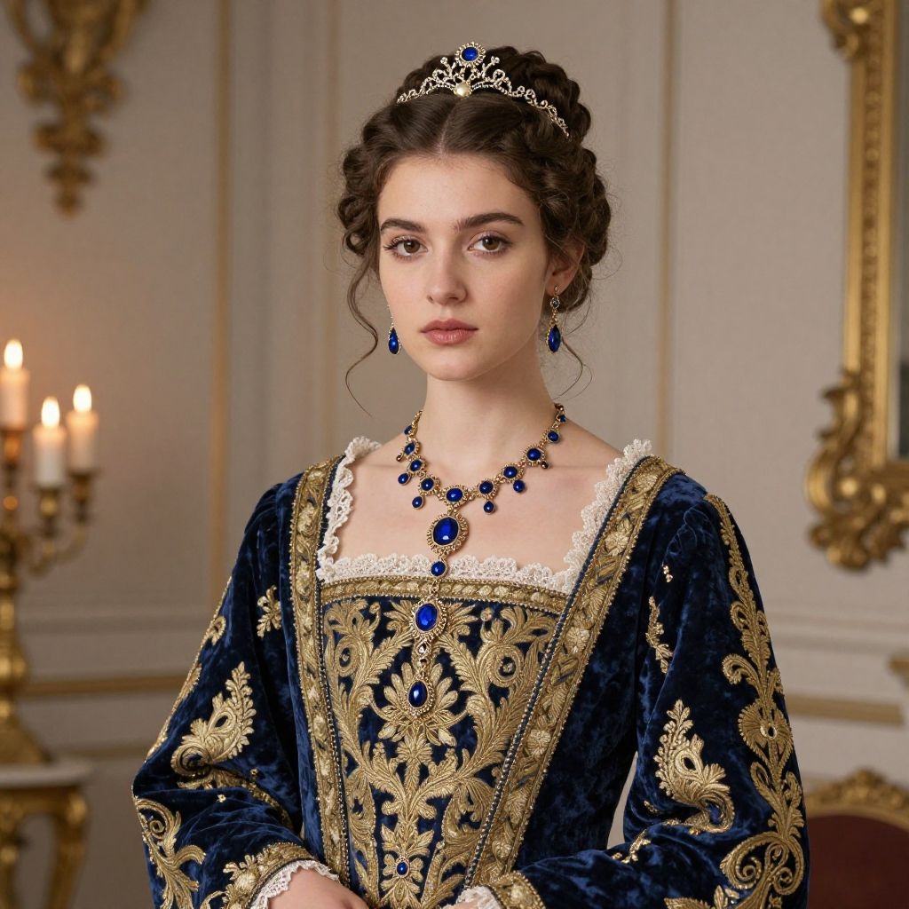 A young woman dressed in an ornate Renaissance-style gown featuring rich blue velvet and intricate gold embroidery. She wears matching elegant jewelry with blue gemstones and a delicate hair ornament, set against a softly lit historic interior backdrop with candles.