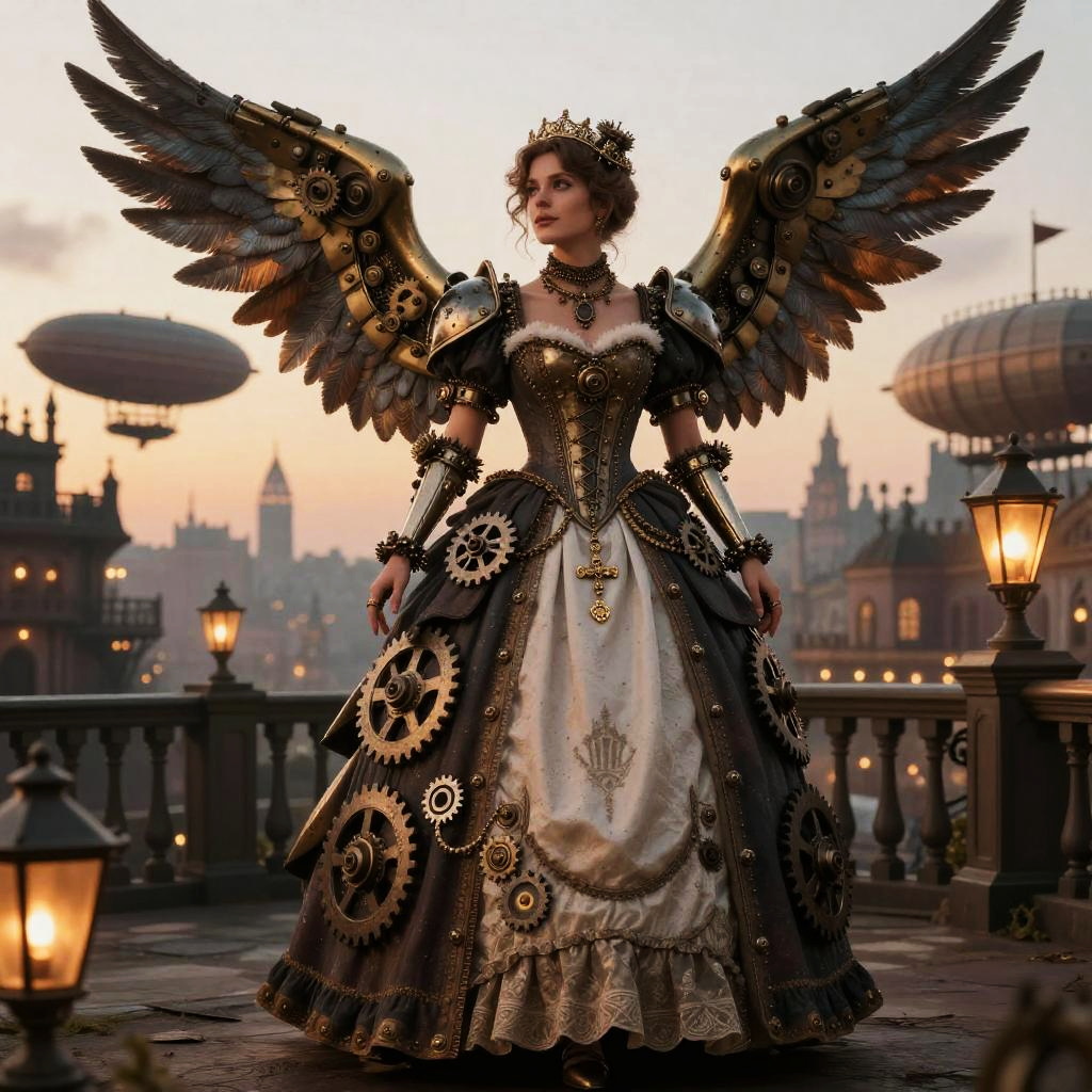 Steampunk outfit art of a mysterious woman wearing an elegant bustle dress combined with mechanical wings and gear-laden accessories, set within a bustling Victorian steam-powered city filled with airships and glowing lanterns at dusk.