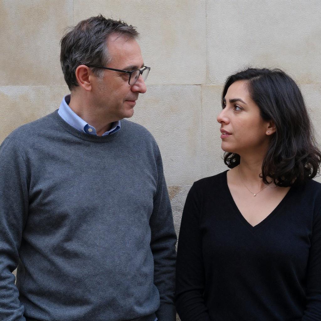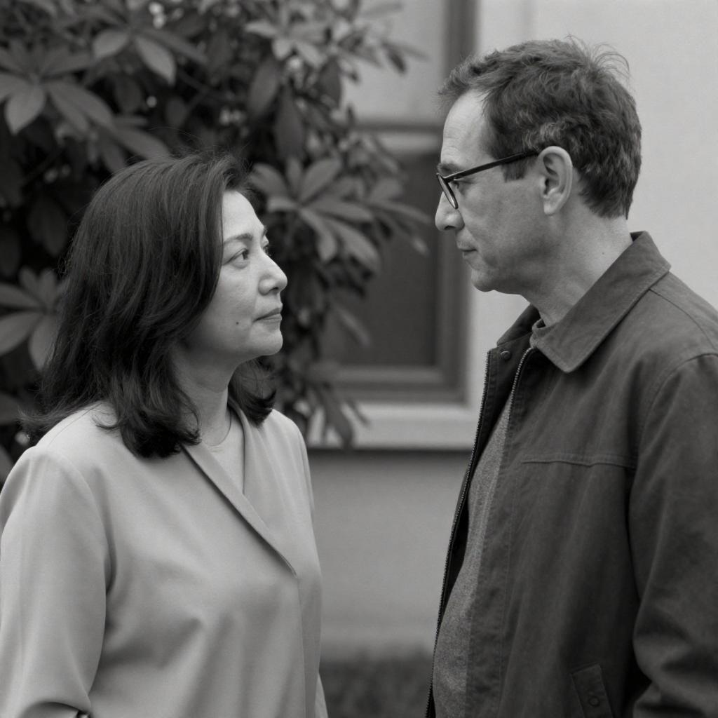 Black-and-white photograph of a middle-aged man and woman standing close, facing each other. The woman, with shoulder-length dark hair, wears a light-colored shirt with a draped fabric. The man, with short dark hair and glasses, wears a dark jacket. They are in front of a leafy plant, with a window in the background. The woman looks down, while the man gazes at her.