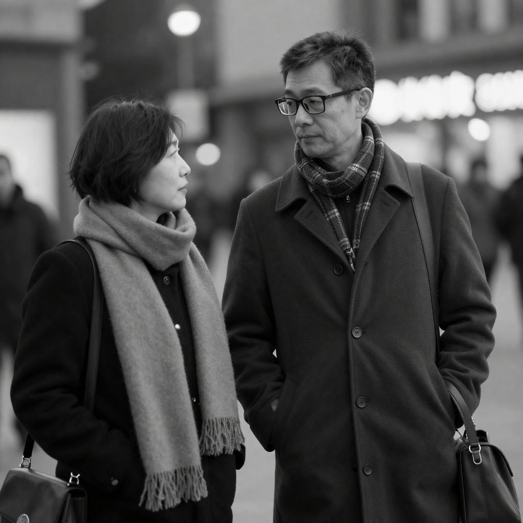 Black and white photo of a middle-aged Asian woman and a middle-aged Caucasian man standing close and facing each other outdoors. The woman has shoulder-length dark hair and wears a light-colored blouse with draped fabric. The man has short dark hair, glasses, and wears a dark jacket over a sweater. They are positioned in front of a leafy plant and a window, with neutral expressions and direct eye contact.