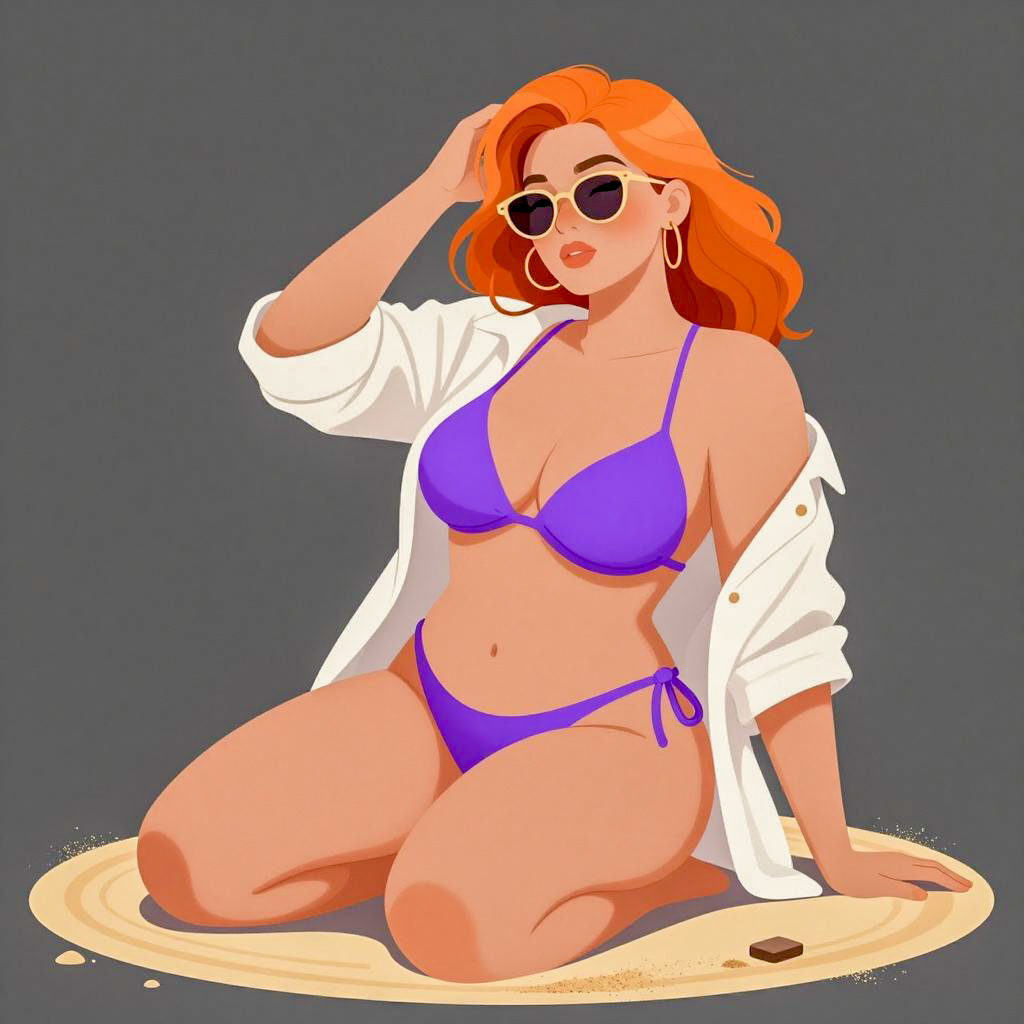 Digital illustration of a young woman with long brown hair, wearing a navy and white one-piece swimsuit, red flip-flops, and sunglasses on her head. She stands on a round sandy base, one hand holding sunglasses, the other on her hip. Gray ured background. Full-body view. Her expression is neutral.
