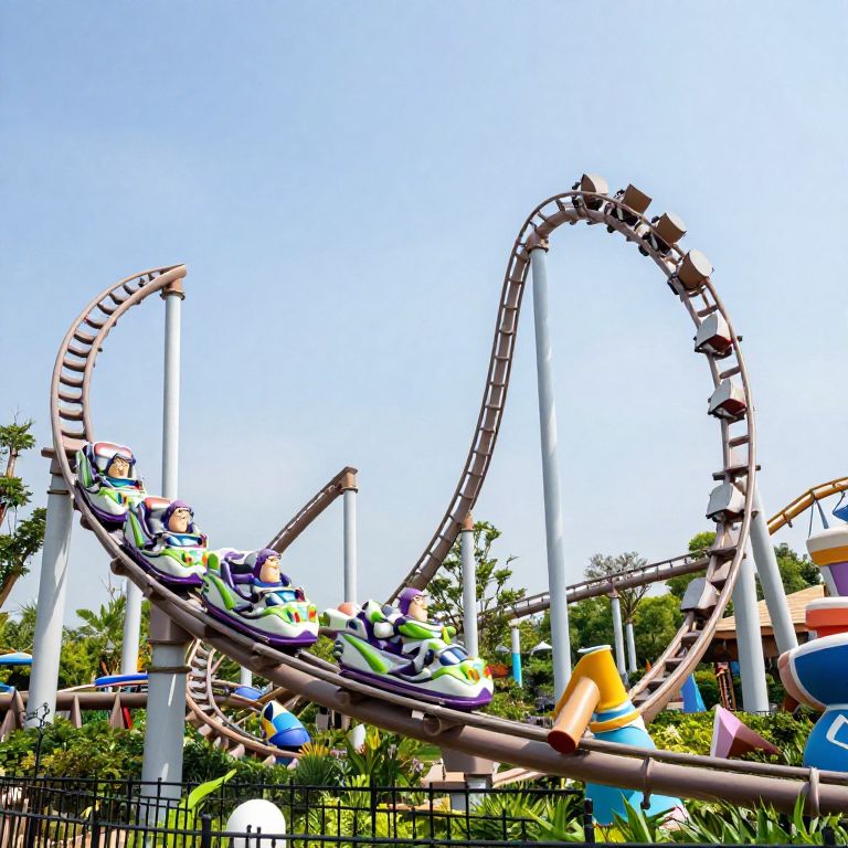 Dutch Art an extremely long rollercoaster with 6 loops, 4 corkscres, situated in Disneyland, in a buzz lightyear theme, in a realistic photographic style.,