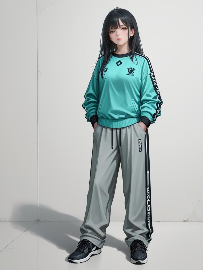 1girl, realistic face, full body shot, Woman, casual sporty, coordinated lilac tracksuit, crew neck sweatshirt, logo detail on chest, long sleeves, ribbed cuffs, matching jogger pants, side pockets, logo near pocket, tapered leg, white and black sneakers, white studio background