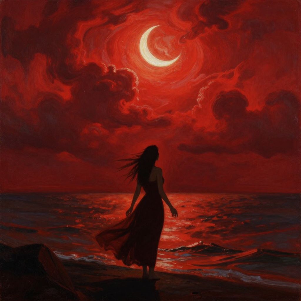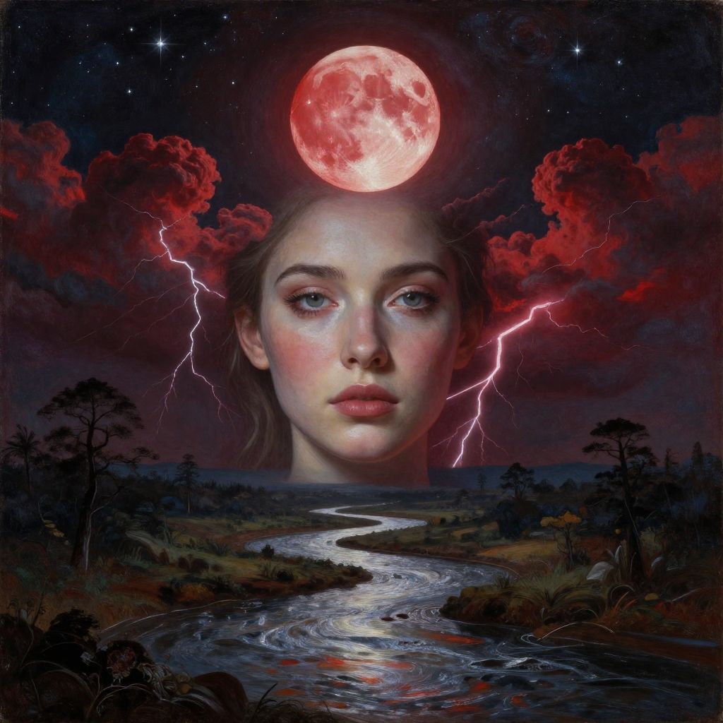 ((masterpiece, best quality, highres, realistic)) Perfect Face, A beautiful landscape, river of blood moonlight and dark red lightning in the clouds with a large sky full of stars, highly detailed oil painting, trending on artstation hq 8k sharp focus high contrast chiaroscuro magical fantasy intricate elegant highly detailed digital painting smooth sharp focus illustration art octane render pixiv dsl, red moon in the sky