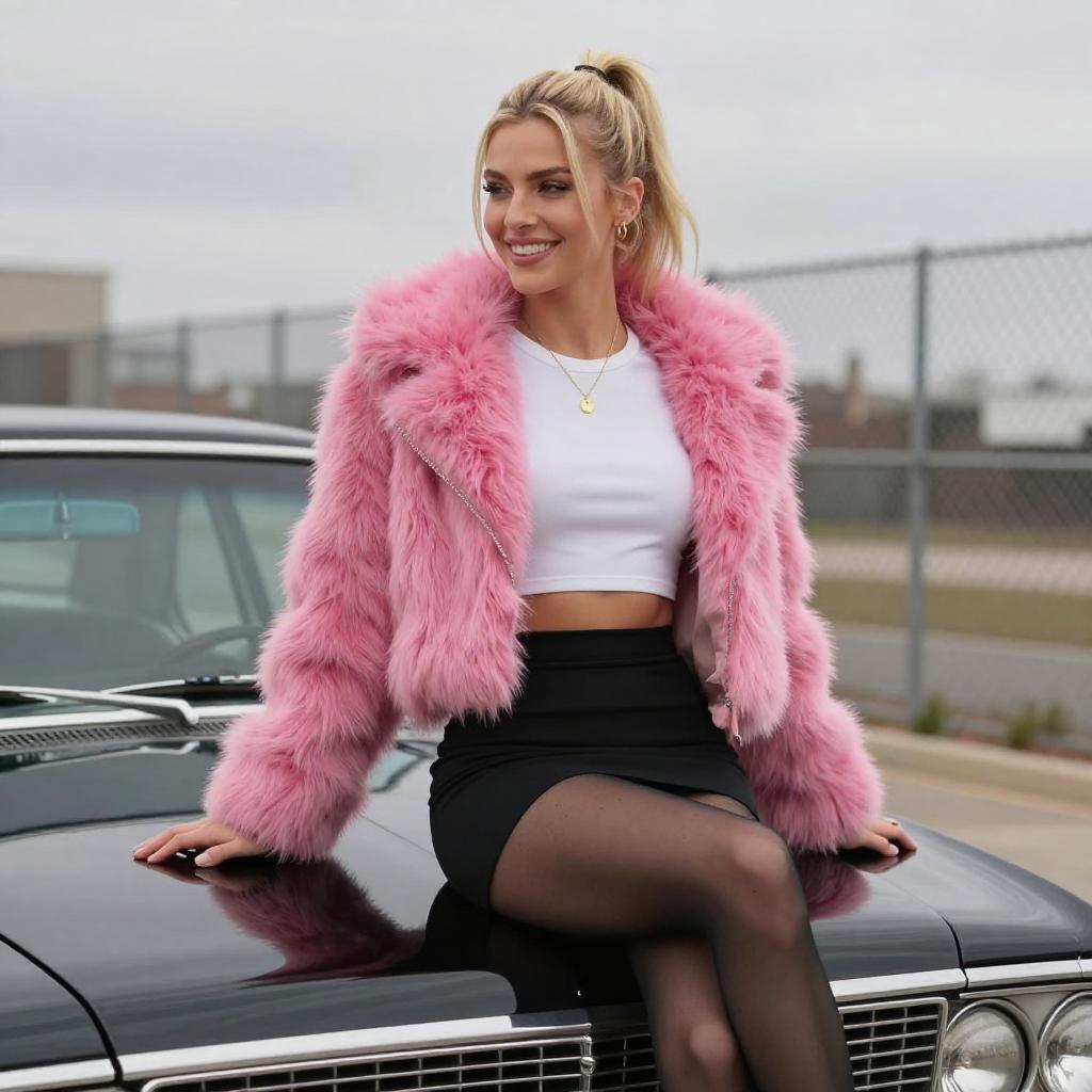 Photograph of a blonde woman with a ponytail, wearing a white crop top, black mini skirt, black stockings, and a vibrant pink fur coat. She sits on the hood of a black vintage car, smiling, with a chain-link fence and overcast sky in the background.