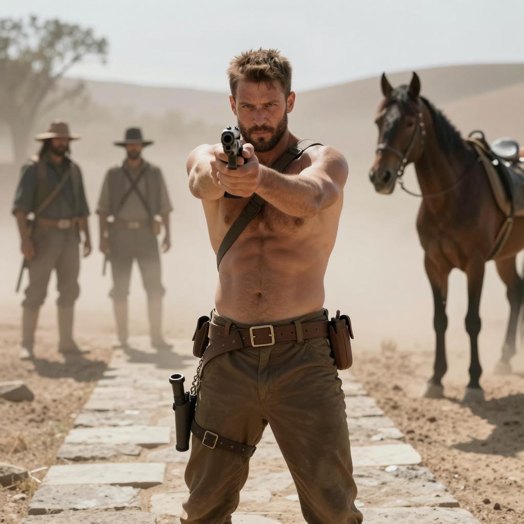 Man with short brown hair and beard, shirtless, wearing brown pants and harness, pointing a gun at the camera. Dusty, arid landscape with two shadowy figures in background and a horse on the right. Smoke in air. Man has intense expression. Two additional figures partially visible in background. Stone pathway underfoot.