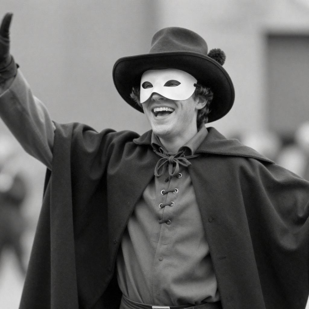 Black-and-white photograph of a man in a Victorian-style costume with a wide-brimmed hat, mask, and open cloak, laughing. He wears a laced-up shirt, gloves, and has a hat with pom-poms on the brim. Background is blurred. His arms are outstretched.