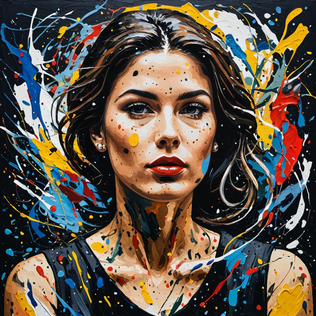 Portrait of elegant lady painted with colorful gouache impasto in the style of Jackson Pollock