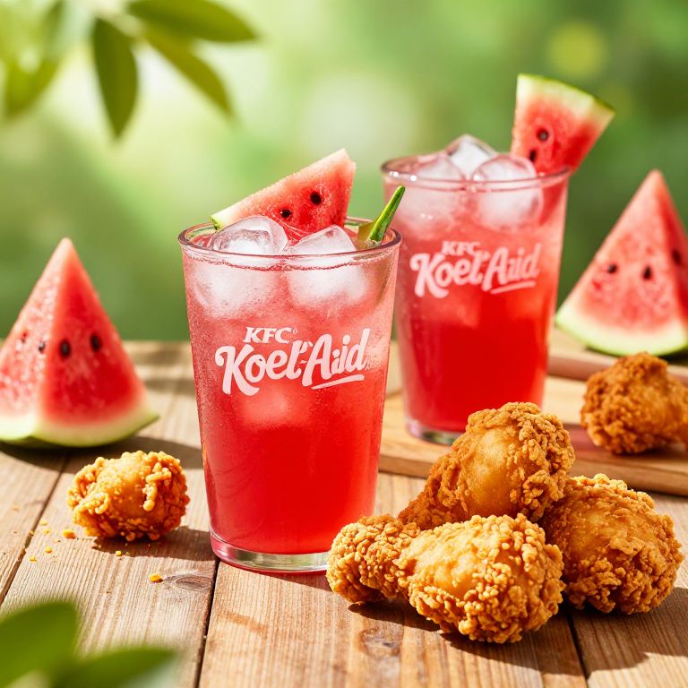 KFC watermelon Kool Aid, vibrant summer picnic scene with a rustic wooden table, ice-cold glasses of red Kool Aid with watermelon slices, crispy golden fried chicken pieces, bright sunlight filtering through green leaves, hyper-realistic food photography style
