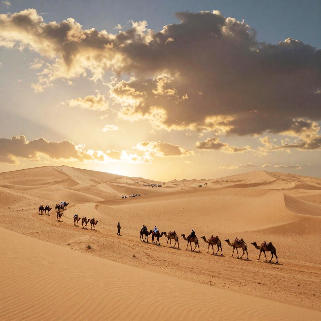 Photograph of a sunlit desert with a caravan of camels, led by a rider, crossing golden sand dunes under a dramatic, cloud-filled