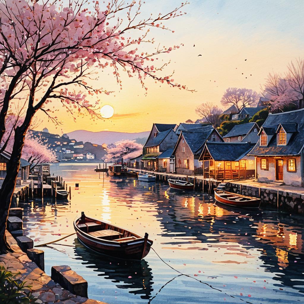 Impressionist watercolor painting depicting a charming old harbor village at sunrise. The scene features a wooden boat floating on calm water with delicate pink cherry blossoms scattered across the surface. Traditional houses line the waterfront with warm light glowing from their windows, while cherry blossom trees frame the composition, enhancing the serene and peaceful atmosphere.