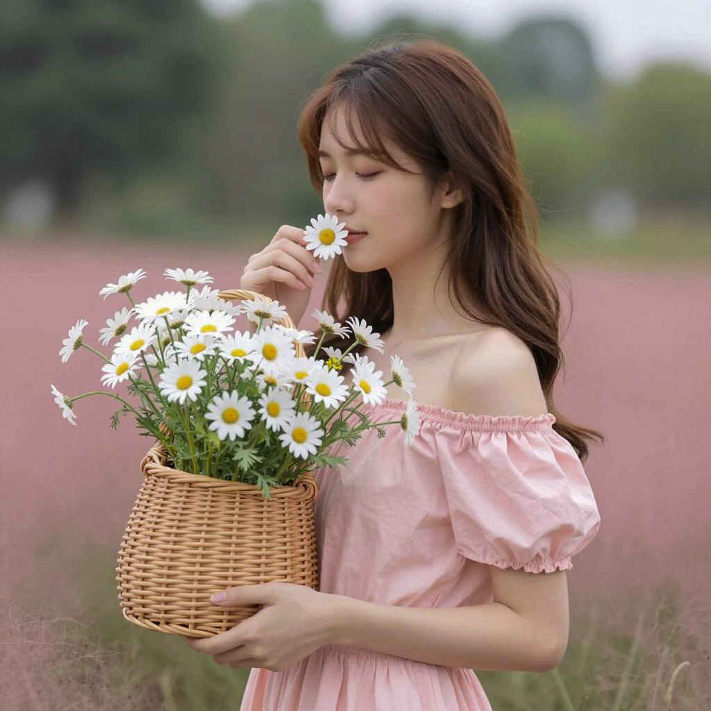 Digital illustration of a young girl with light brown hair in a braid, fair skin, and large brown eyes, leaning close to a ginger and white cat. They are surrounded by white daisies in a sunlit meadow. The girl's face is gentle and focused on the cat. The cat looks up at her with wide eyes. Bright sunlight filters through the flowers.