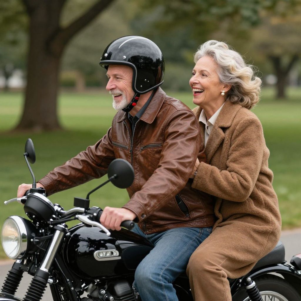 Joyful older couple sharing a moment of laughter while riding a classic motorcycle through a serene park setting, with the man wearing a sleek black helmet and brown leather jacket, and the woman dressed in a cozy brown coat and pearl earrings, both embracing the adventure together.