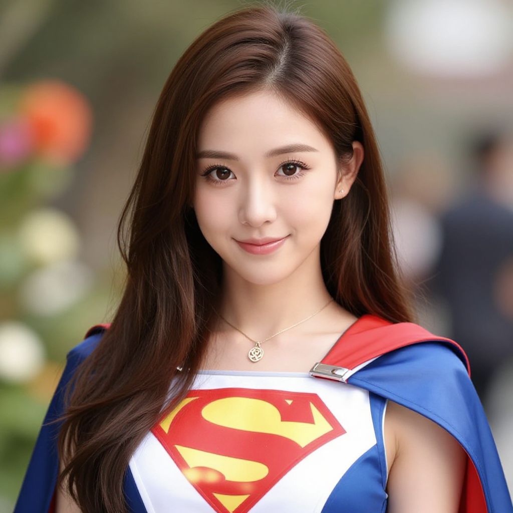Photograph of an East Asian woman with long, straight, dark brown hair, wearing a costume resembling Superman's outfit. She has fair skin, delicate features, and is smiling softly. The costume includes a blue cape with a red interior, a white shirt with a large red and yellow Superman 'S' emblem on the chest, and a silver heart necklace. The background is blurred, featuring greenery and indistinct colorful objects. The image has a soft, natural light, highlighting her youthful and attractive appearance.