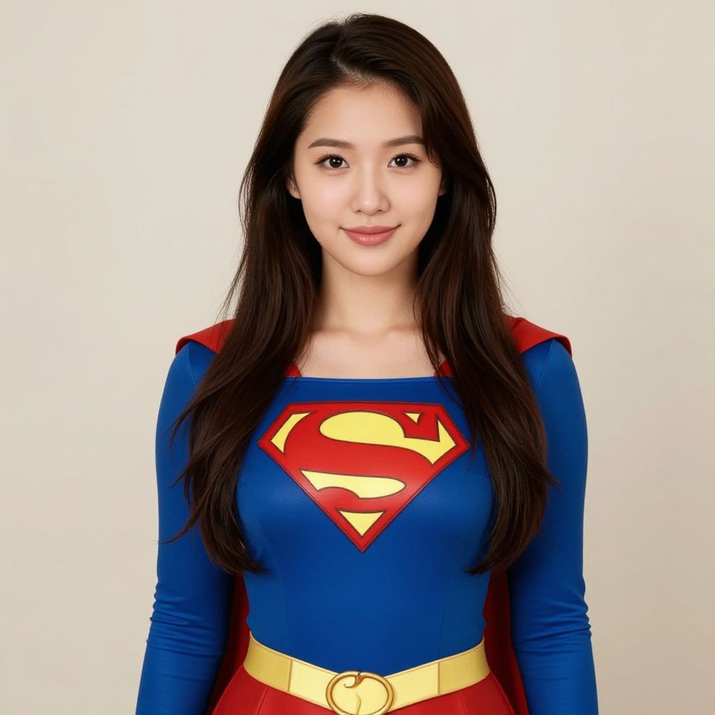 Photograph of an Asian woman with long brown hair, wearing a Superman costume with a blue cape, red and white emblem, smiling, blurred outdoor background