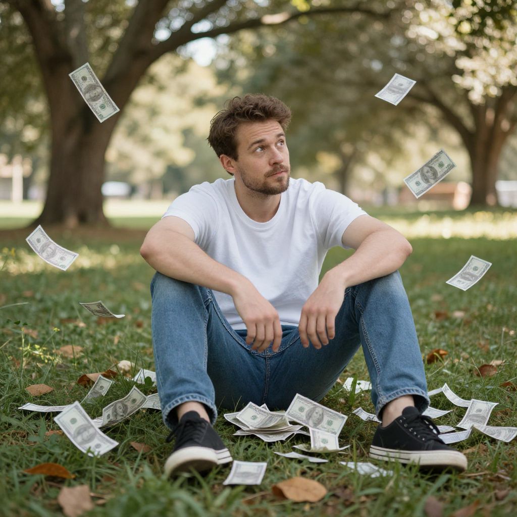 A confident man sitting on money outdoors, in a natural setting with green grass and sunlight filtering through trees, cash bills spread around like leaves, symbolizing unexpected fortune and freedom, natural tones with a soft, dreamy atmosphere.