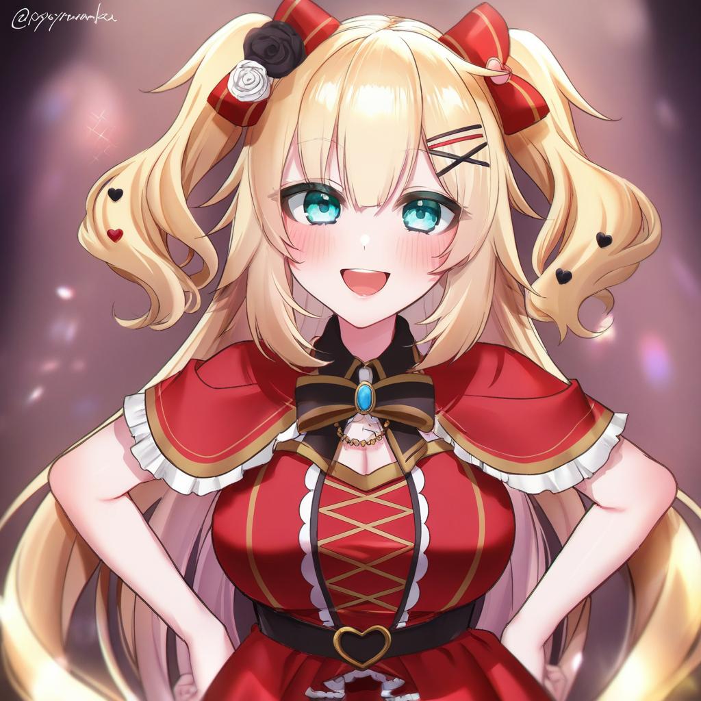 Akai haato (gothic lolita), hololive, 1girl, blue eyes, aqua eyes, hair between eyes, blonde hair, official alternate hairstyle, very long hair, heart hair ornament, x hair ornament, two side up, hair bow, hairclip, large breasts, medium breasts, red dress, virtual youtuber, virtual youtuber, by artist yayoi maka, leet