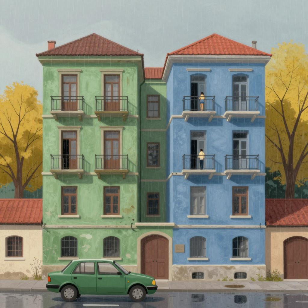 Illustration of two tall, weathered buildings. Green building on left, blue building on right. Both with red roofs, multiple windows, and balconies. Green car in foreground. Yellow tree with bare branches in background. Rainfall visible. Two people on upper balconies. Street with puddles in front.