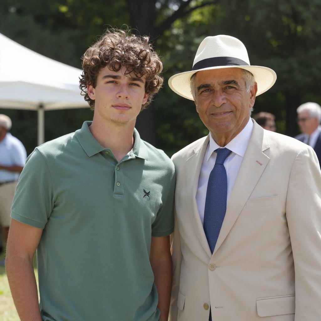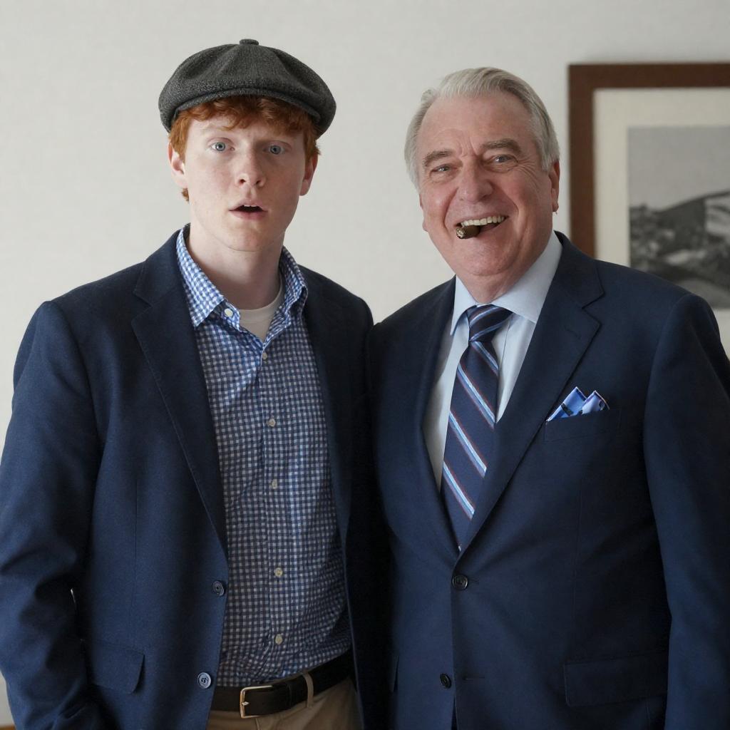 Photograph of two men standing close together. Young man with red hair, blue jacket, checkered shirt, and gray flat cap, looks surprised. Older man with gray hair, blue suit, striped tie, pocket square, and cigar in pocket, smiles broadly. Indoor setting.