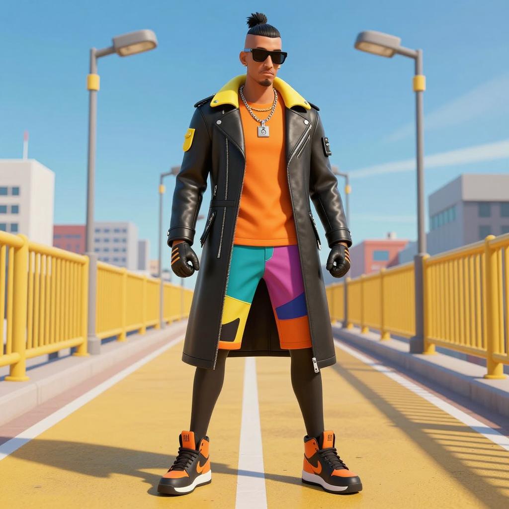 Fortnite brite bomber, photo of a person, standing outdoors, bright daylight, wearing neon green and orange jacket with pink hood, reflective blue sunglasses, colorful gloves, black pants, orange laces on black boots, pink leg warmers, rocky background, stone building, trees in background, modern urban setting, full body shot, casual style, realistic CGI, vibrant colors, summer vibe, mountain in the distance