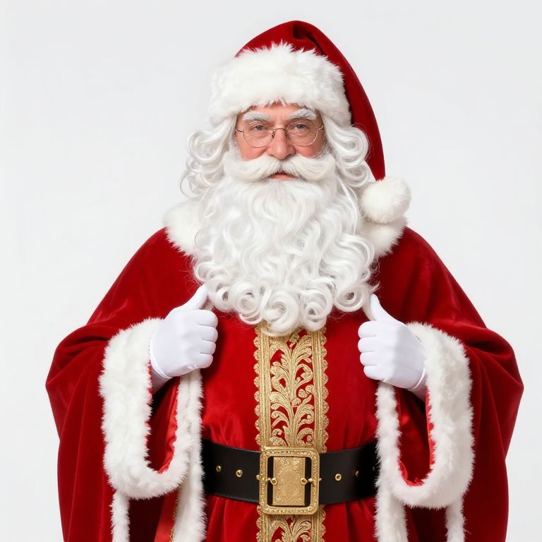 Male santa claus with a white beard and a red robe with gold embroidery and a gold belt.