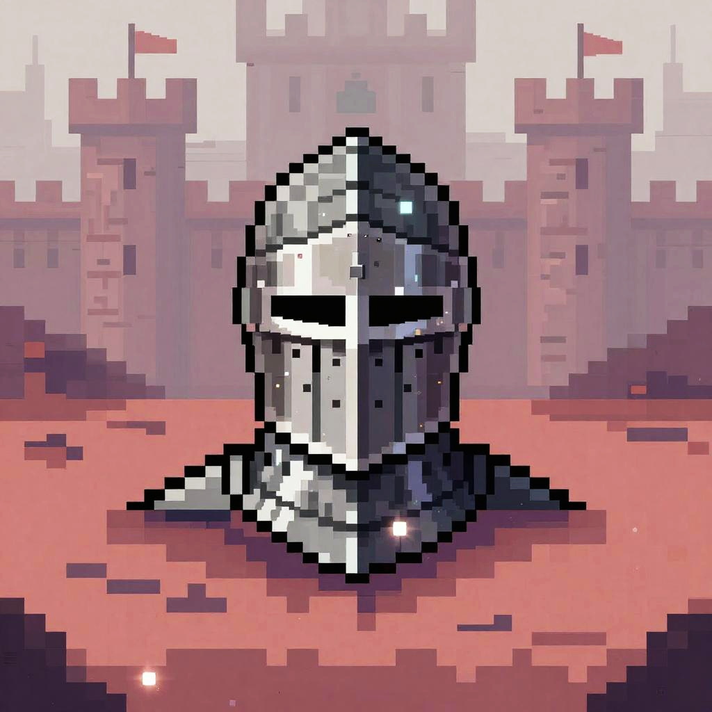 Pixel art 8-bit medieval knight visor in foggy castle courtyard, using steel grays and muted reds 16-color palette, retro 8/16-bit arcade vibe, sharp pixel edges, clean 1px outlines, deliberate checker dithering, subtle CRT bloom and scanlines, layered parallax tiles, soft pastel haze, tiny HUD glyphs, subpixel highlights on key features, balanced contrast, centered portrait sprite, reflections and light glints, consistent tile seams, nostalgic game intro energy