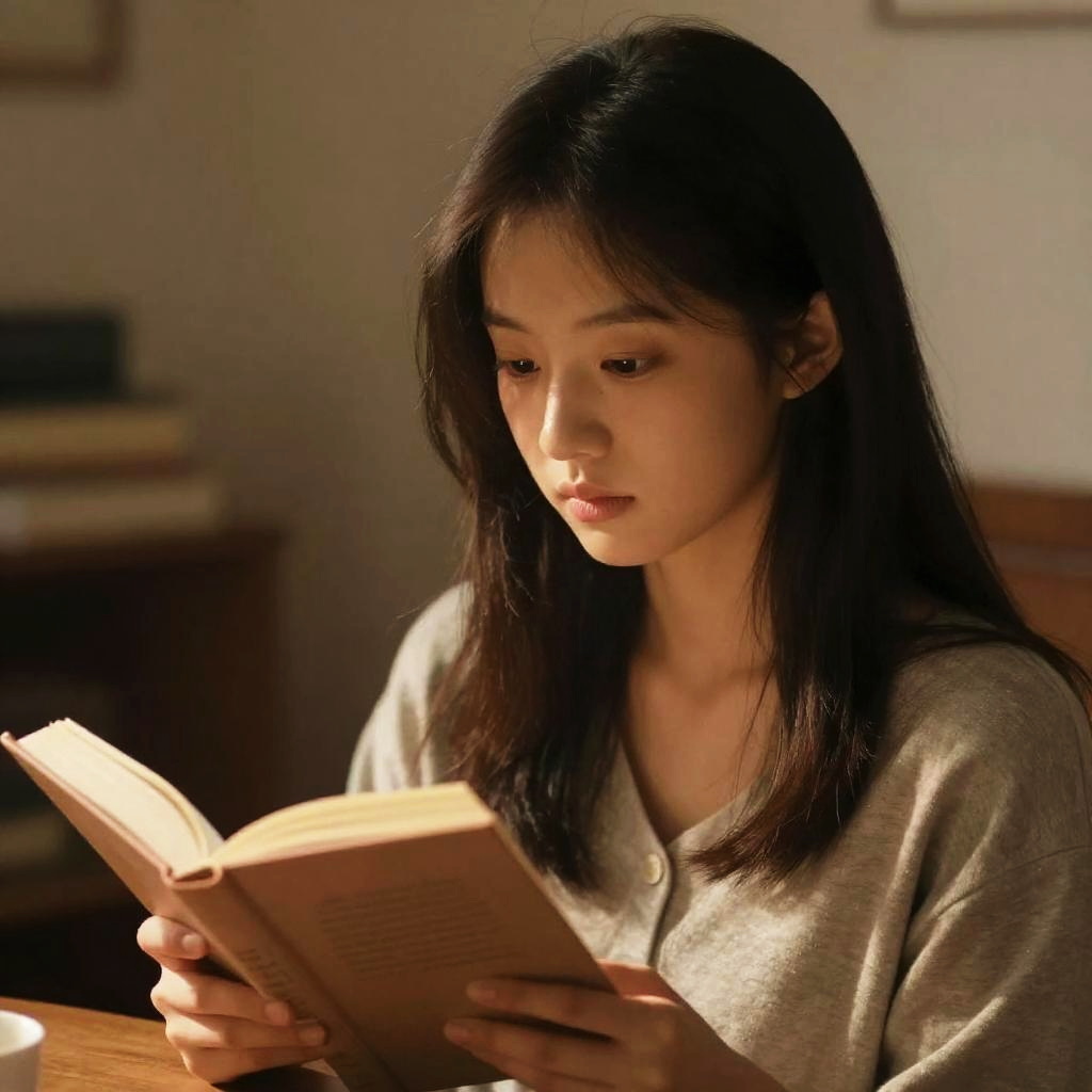 Realism realistic digital art girl reading a book in a cozy room, warm ambient lighting casting gentle shadows, meticulous detail on her eyes, hair, and the texture of the book pages.