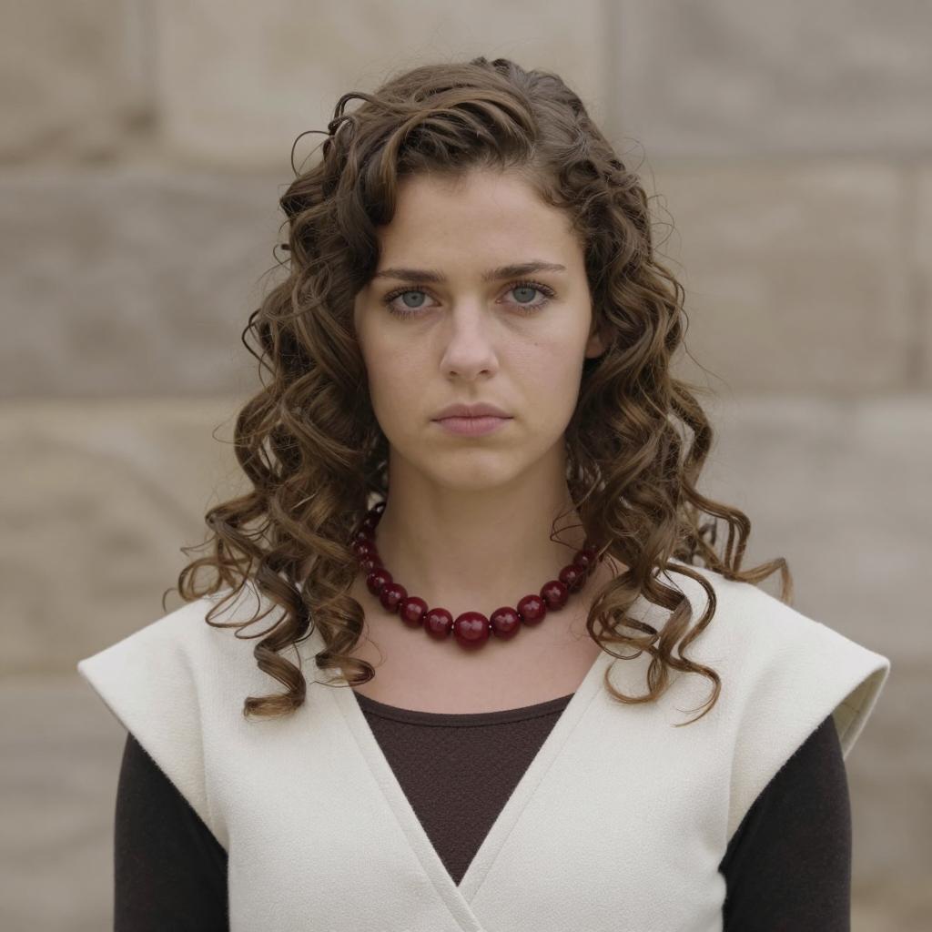 Brown highlighted pixie cut, photorealistic portrait of a young woman with short brown hair, side-swept bangs, light skin, green eyes, wearing a maroon lace-trimmed top, silver necklace with a large pendant, neutral brown background, soft lighting, slight blush on cheeks, serious expression, close-up, studio shot, subtle shadows