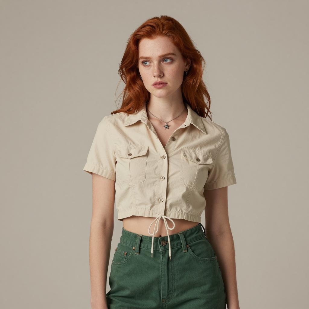 Photorealistic portrait of a young woman with red hair and light skin wearing a beige cropped button-up shirt with lace-up front and short sleeves paired with green high-waisted pants. She has a simple necklace featuring a star pendant and a slightly serious expression. The image is set against a neutral beige background with soft, studio lighting, showing a 3/4 view with symmetrical composition.