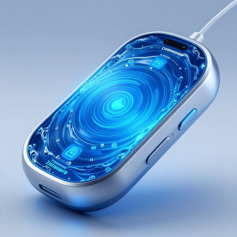 Flowmodoro concept art showing a futuristic time management device combining flowing water patterns with sleek modern technology, vibrant blue and silver colors, dynamic lighting, digital and organic fusion, high detail, soft glowing effects