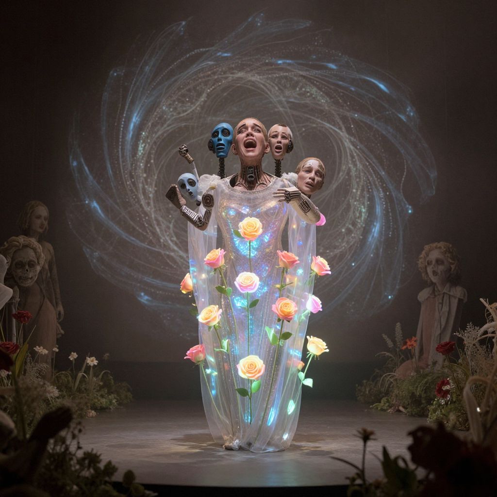 Photograph of a surreal, dark-themed performance. A central figure with pale skin and black hair, wearing a sheer, glowing white dress adorned with illuminated roses, stands on a stage. Three robotic heads with blue and pink skin tones, one with a skull face, are positioned above her shoulders. The background features swirling, ethereal light patterns, and the stage is flanked by floral arrangements. The atmosphere is eerie and otherworldly, blending elements of fashion, robotics, and fantasy. The central figure's expression is ecstatic, with mouth open.