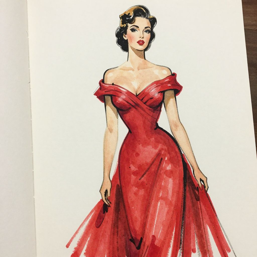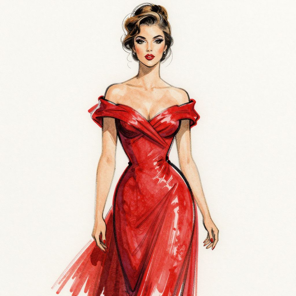 This is a digital drawing of a stylish woman with fair skin and dark brown, wavy hair styled in an elegant updo. She wears a vibrant, off-the-shoulder red gown with a fitted bodice and a flowing skirt. The dress has a slight sheen, adding texture to the fabric. Her red lipstick matches the gown, and she gazes confidently at the viewer with a slight smile. The background is a simple white, making her and her red dress stand out prominently. The art style is reminiscent of classic fashion illustrations, with bold, clean lines and a focus on elegance and sophistication.