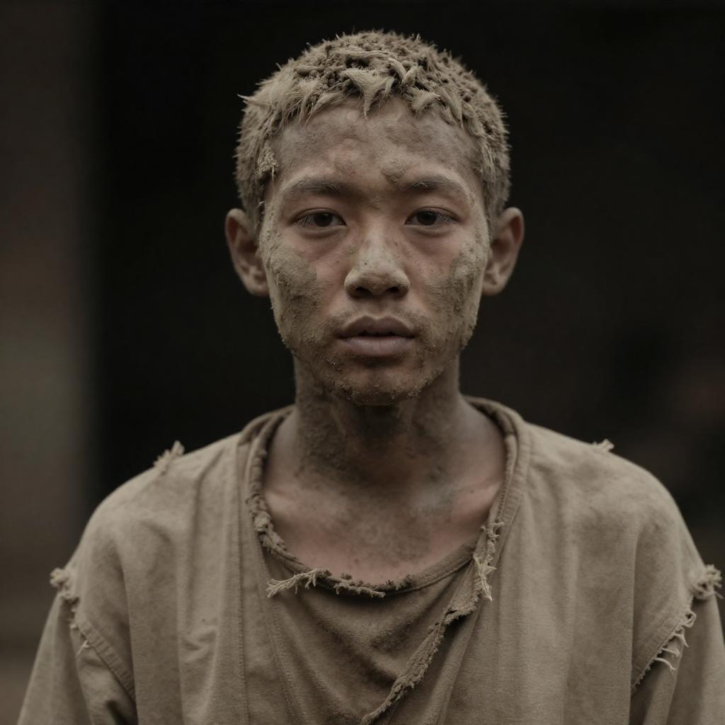 Photograph of a person with a heavily ured, mud-covered face and body, wearing tattered, beige clothing. The person's expression is neutral, with slightly parted lips. The background is dark, emphasizing the subject's rough, earthy appearance. The image has a dramatic, low-light effect.