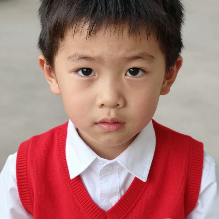 Joseph, a close up of a young boy with a red vest and a white shirt