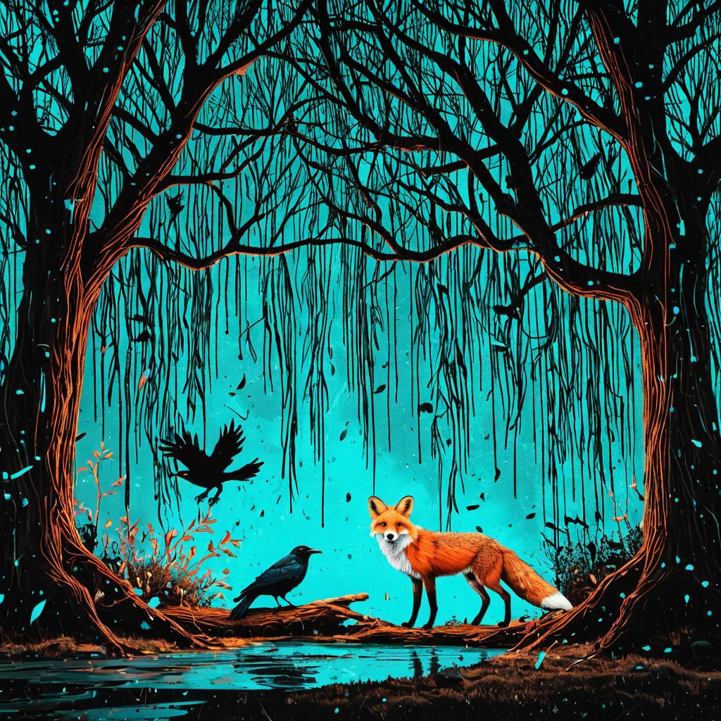 A surreal wildlife artwork where a serene forest scene is enclosed within the delicate form of a curled fern frond. The composition features a family of red foxes nestled among roots, set against twilight forest with glowing fungi. Paint splatters surround the design, adding texture and artistic flair.