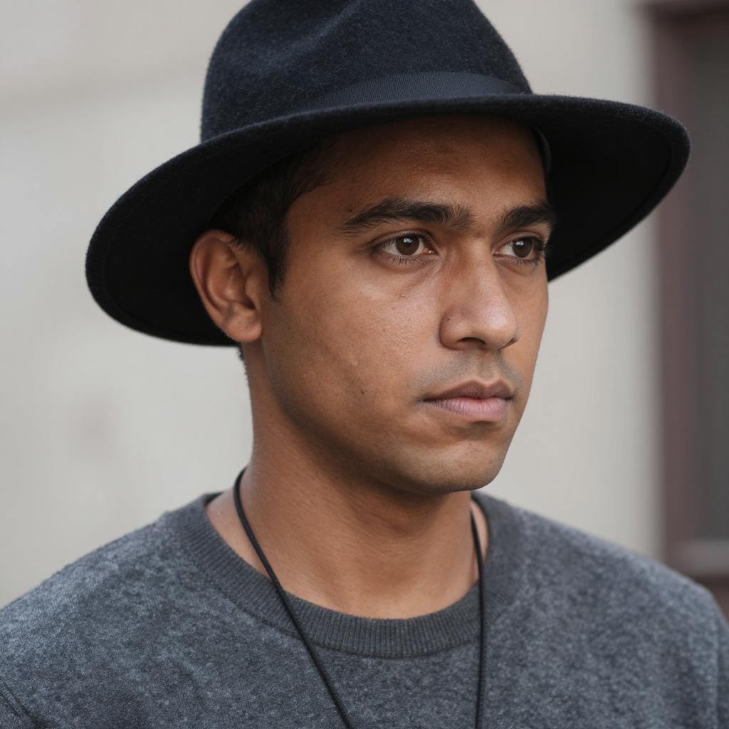 Portrait of a young man with a tanned complexion, dark hair, and wearing a light brown hat. He has his eyes closed and a serious expression on his face. The man is dressed in a black turtleneck and is touching his right cheek with his left hand, which features a prominent diamond ring. The background is dark, emphasizing the subject's thoughtful mood.