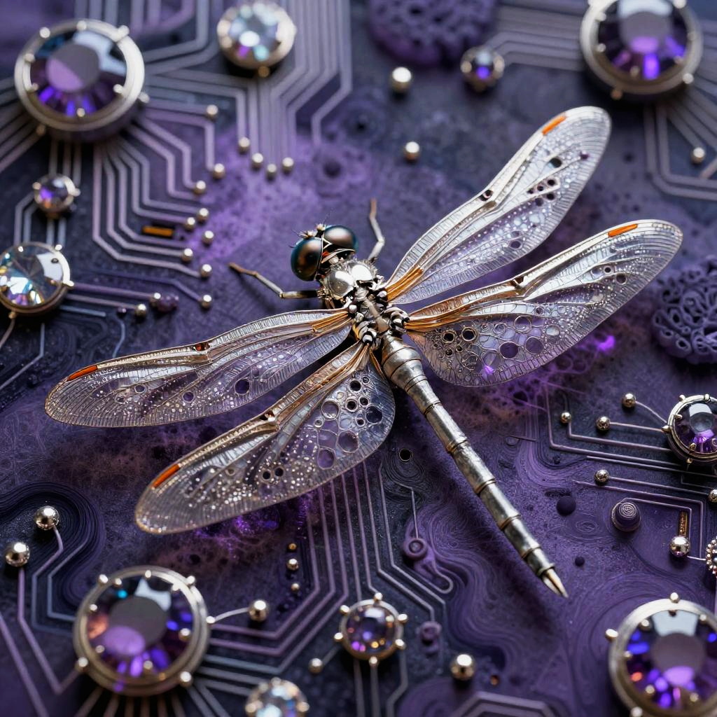 Purple ink, silver ink, surrounded with intricate circuitry and jewels, most detailed image of a very high quality masterpiece, glossy surface, vibrant colors, complex composition, volumetric lighting, exquisite detailed features, photorealistic, deep ocean, dark water, Retro Futuristic Image, dragonfly, entomological diagram