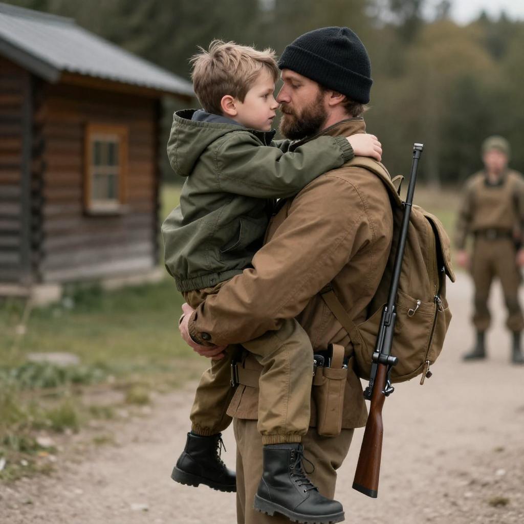 Photograph of a man and young boy in a forest, both wearing brown jackets, red hats, and yellow gloves. The man holds a black rifle, crouching protectively behind the boy, who sits on the ground. Leafless trees fill the background, creating a somber, winter atmosphere.