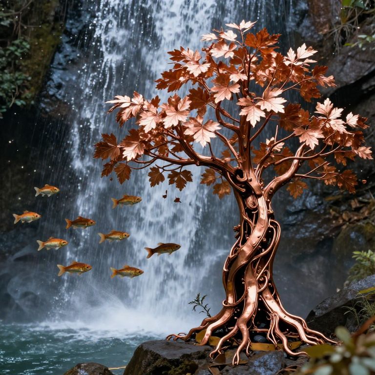 A mechanical tree with copper leaves hums lullabies to a school of singing fish swimming upstream against a waterfall of stardust.